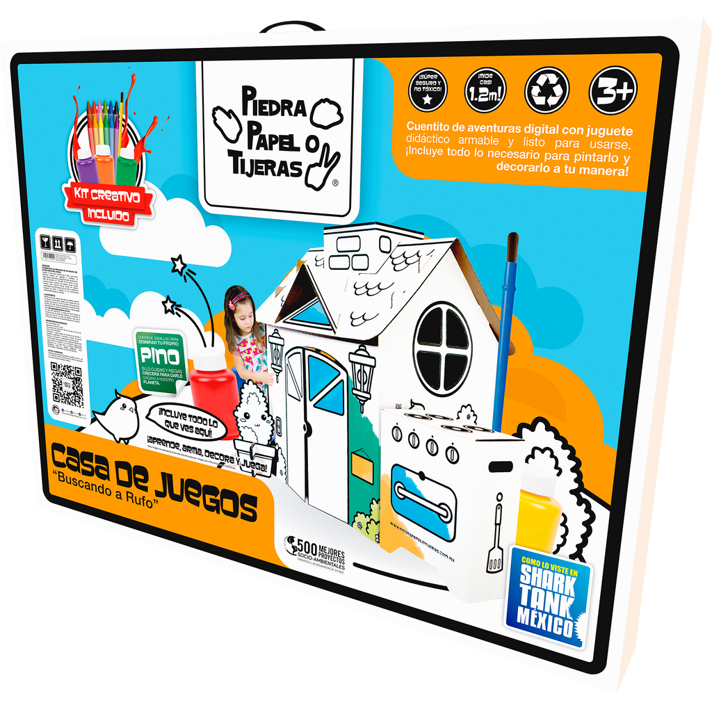 La Casa de Juegos de Piedra, Papel o Tijeras comienza con el cuento Buscando a Rufo, donde los niños aprenden el valor del trabajo en equipo. Después de la lectura, podrán construir y decorar su propia casita, un espacio creativo que brinda horas de diversión y convivencia en familia.